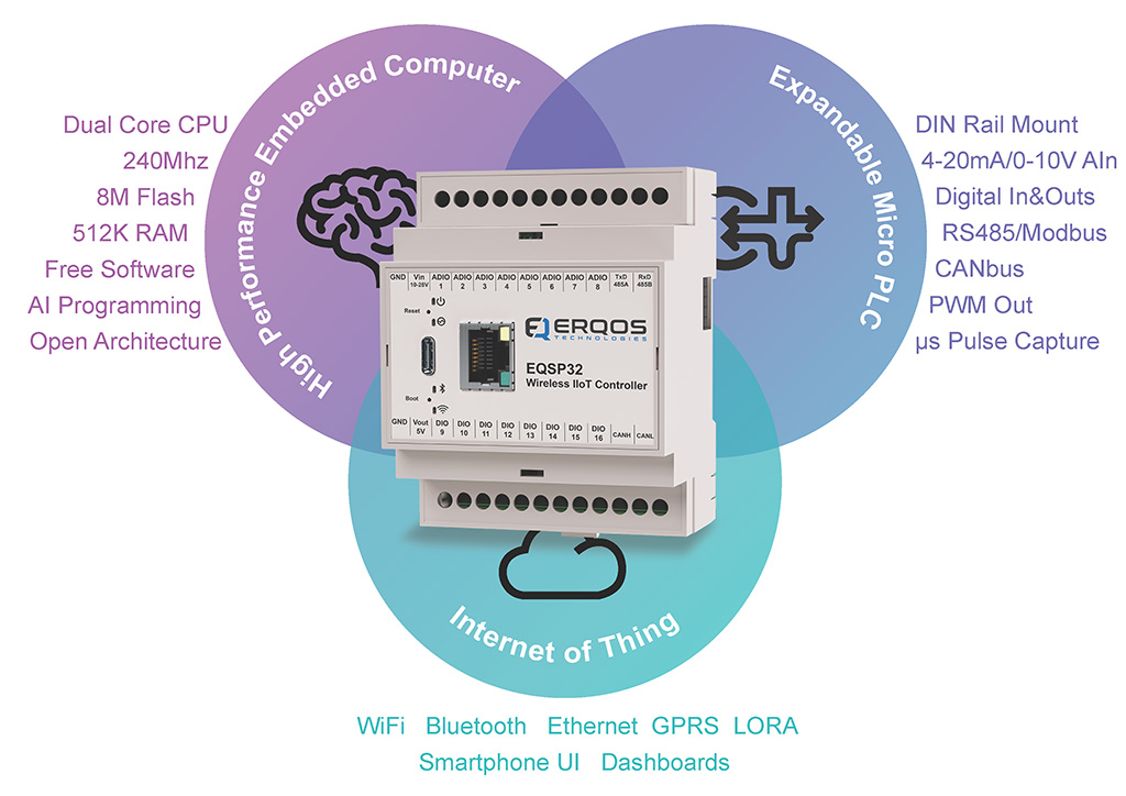 ERQOS EQSP32 Serisi, ESP32-S3 işlemci tabanlı, akıllı IoT uygulamaları için geliştirilmiş endüstriyel mikro PLC ailesidir.